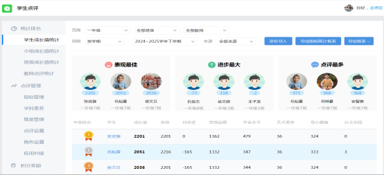 依托“人人通空间——学生点评”,课堂、活动、社团全过程伴随式留痕。一次朗读、一次跳绳、一次志愿服务,即时上传、即时赋分,生成唯一时间戳。数据真实、来源可靠,学生点开个人成长轴,可见“日脚印、周曲线、月台阶”,成长路径一目了然。