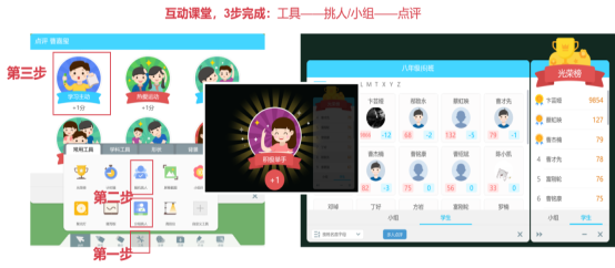 教师使用“互动课堂”上课时进行点评互动。及时点评、及时奖励,课堂小手举不停。