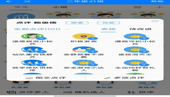学生的日常学习或生活表现,任课教师可利用课堂外的时间,通过人人通空间APP进入到学生点评移动端,回顾课堂学生表现,教师可批量评价部分学生或全班学生。