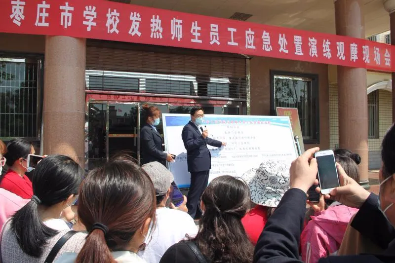 4月28日上午,全市学校发热师生员工应急处置演练观摩现场会在滕州三中召开。枣庄市教育局党组成员、副局长高玉龙出席并讲话。枣庄市卫健委党组成员周智生出席会议。