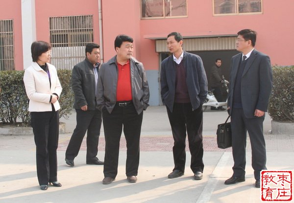 图为市教育局局长张磊(左二)在市中区政府和教育局相关负责人的陪同下,在枣庄四十六中调研