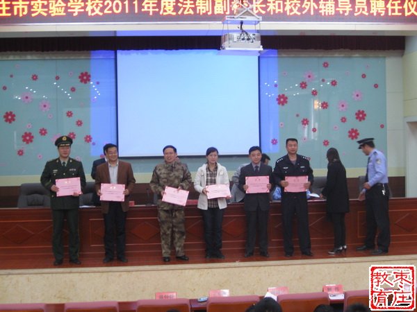 启动仪式上,宣读了《枣庄市实验学校关于聘任法制副校长和校外辅导员的决定》,孙飞校长为新聘任的法制副校长高新区凤鸣湖派出所所长张孝营同志颁发了聘书并致辞表示祝贺,新任法制副校长代表所聘人员作了表态发言。