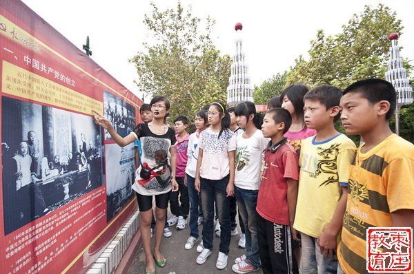 9月2日,学校德育教师在德育墙前为新同学讲解我党90年的光辉历程