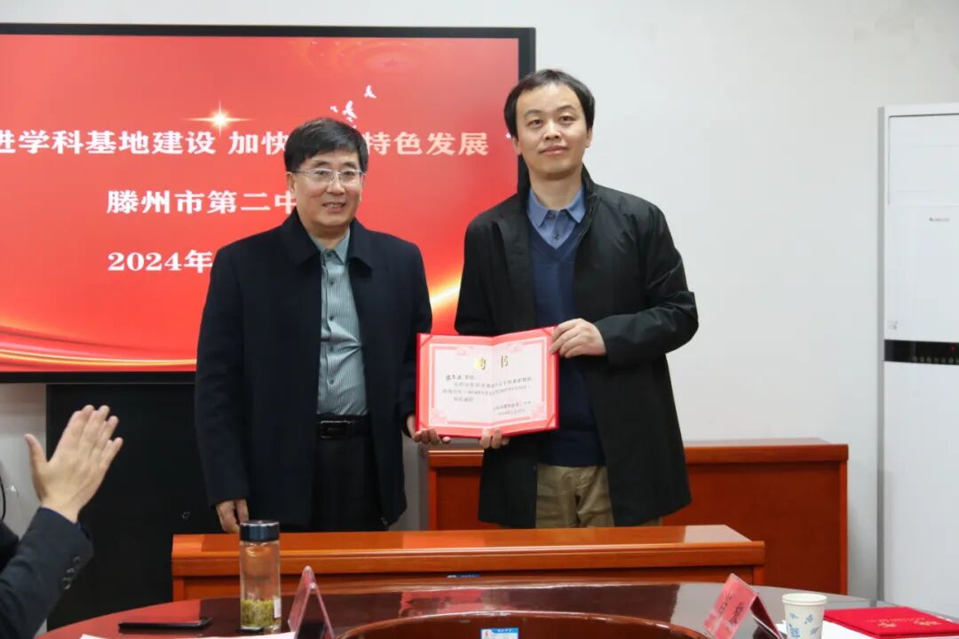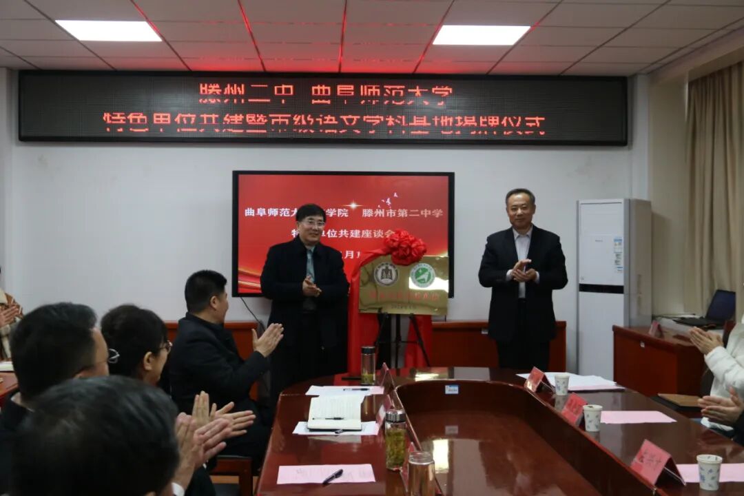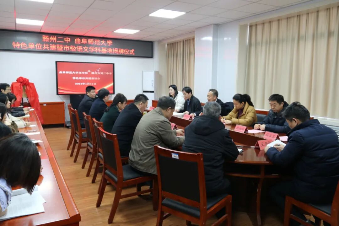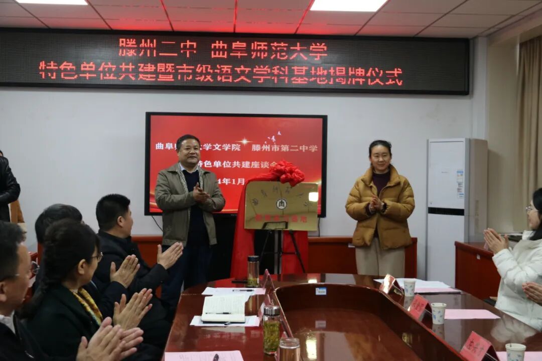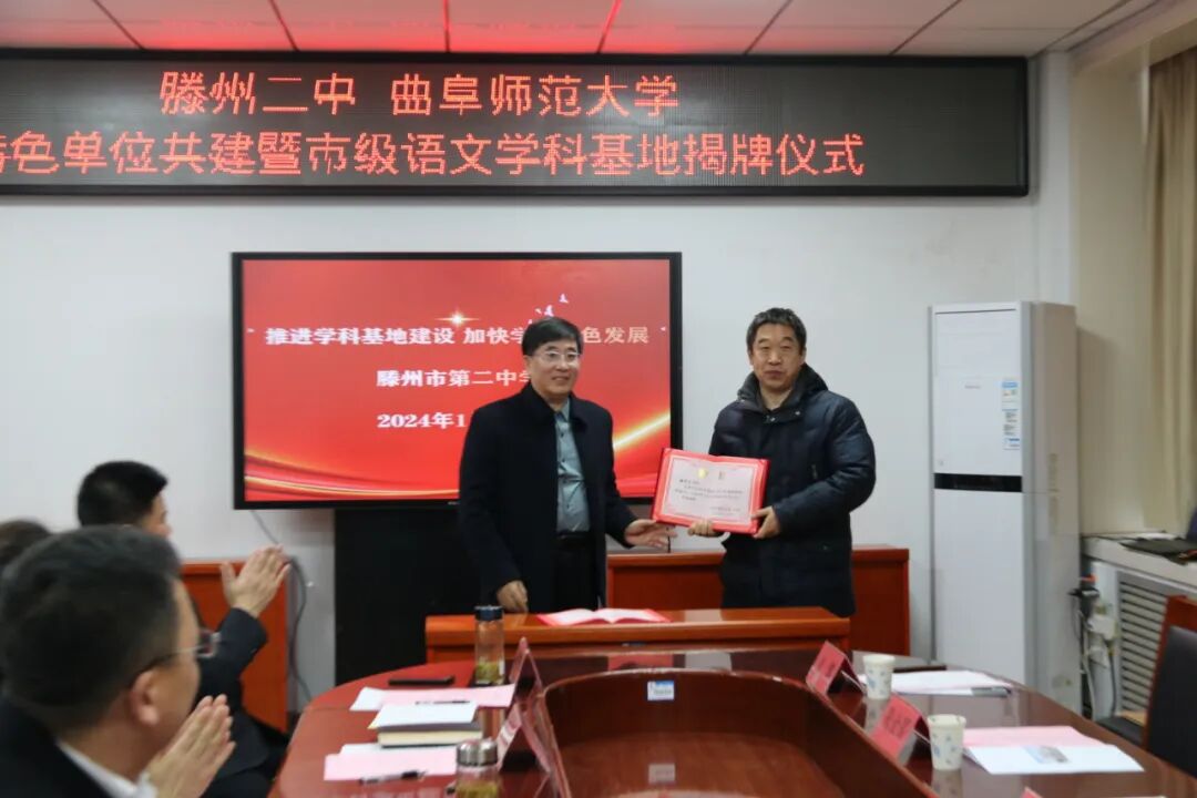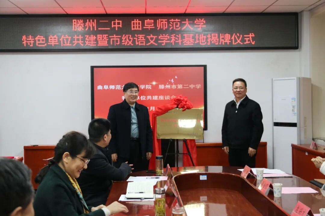 为深入推进强科培优行动,积极探索普通高中特色多样发展的有效路径,滕州二中在“双提”目标的引领下,依托语文学科基地,全面改革育人方式,加快学校高质量发展。2024年1月12日,滕州二中与曲阜师范大学特色单位共建暨市级语文学科基地揭牌仪式在滕州二中举行。
