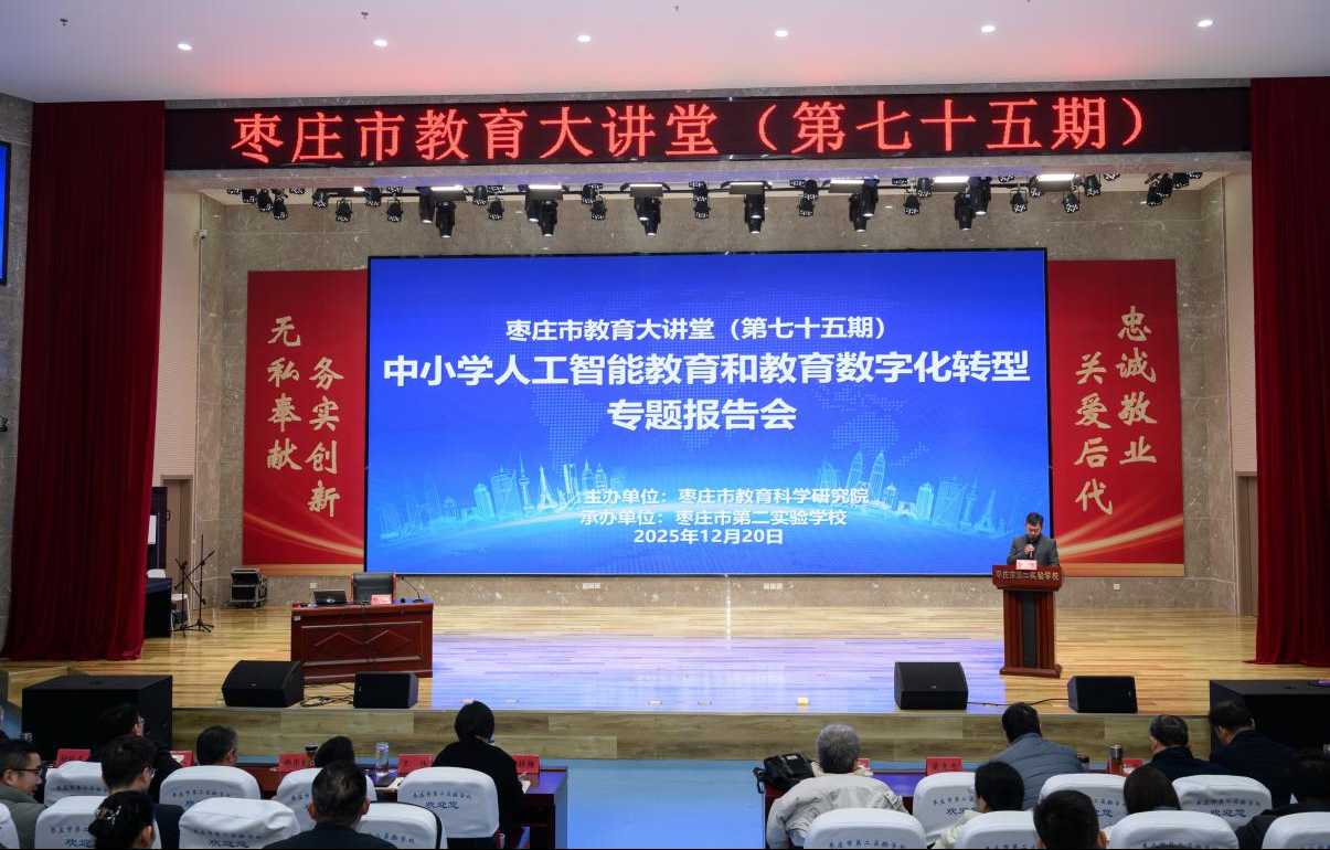 为深入贯彻落实国家及省市关于中小学人工智能教育和教育数字化转型战略部署,推动人工智能与教育教学深度融合,12月20日,枣庄市教育科学研究院在枣庄市第二实验学校报告厅举办枣庄市教育大讲堂(第75期)活动。本次活动以“中小学人工智能教育和教育数字化转型”为主题,立足中小学人工智能的真实场景应用,紧紧围绕中小学人工智能教育政策体系、课程实施、应用场景和学校教育数字化转型等工作进行交流。